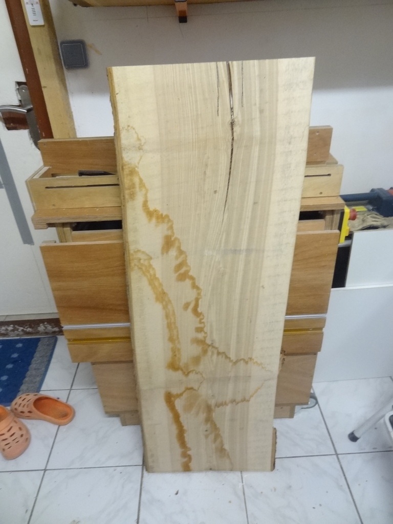 Tout commence par un beau plateau de 27 mm que je vais déligner, dégauchir et raboter.