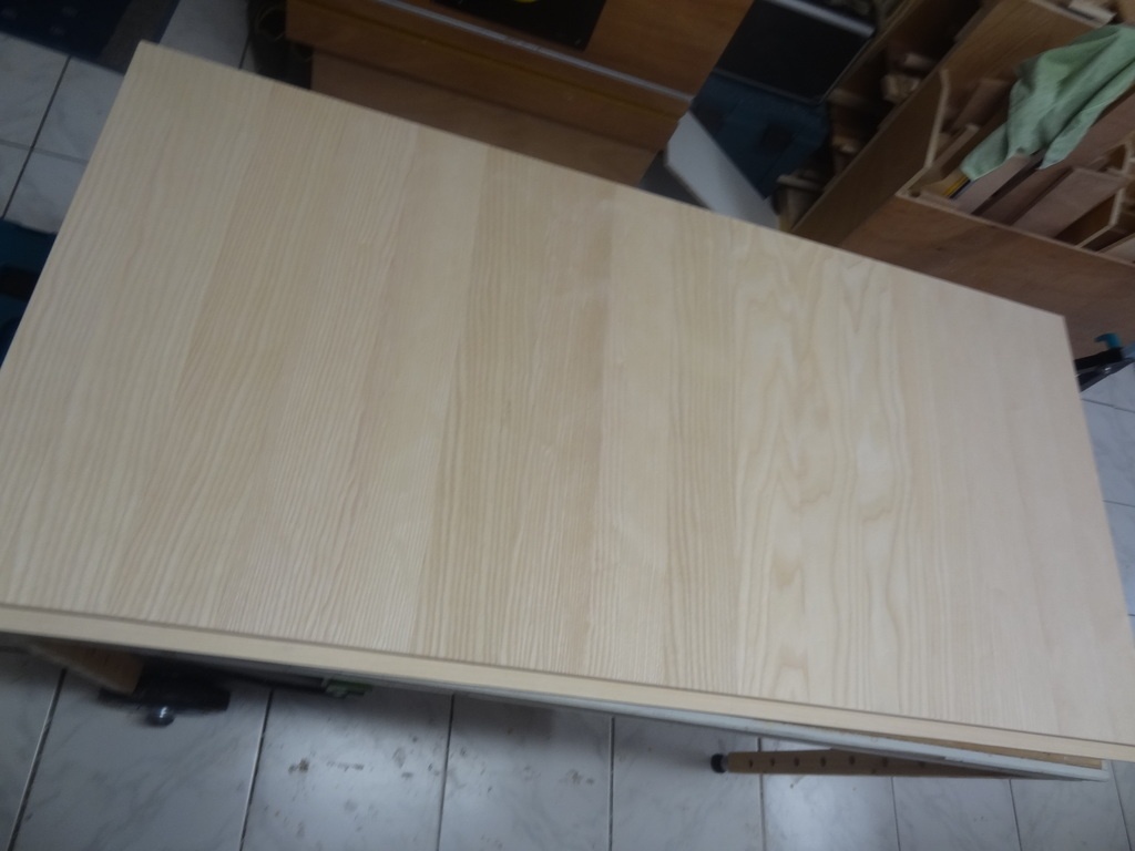 Une fois le collage terminé, je m'attaque à la découpe des feuilles de stratifié. Stratifié gris en façade et stratifié blanc pour le contrebalancement.