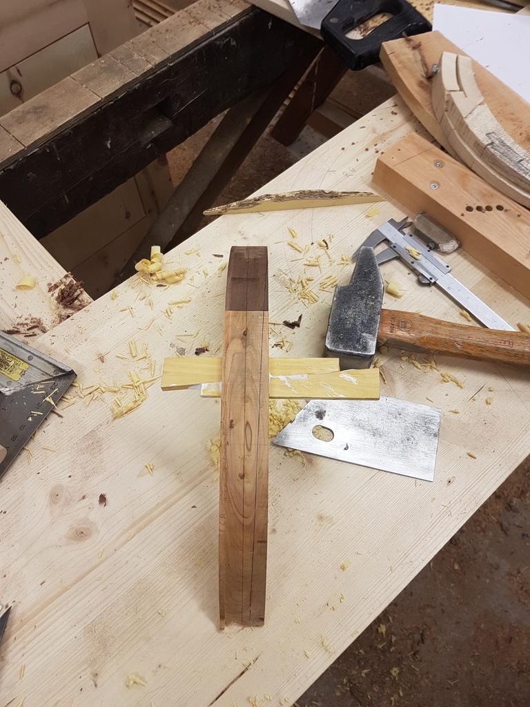 Ensuite j'affûte mes ciseaux pour allé évider les fonds d'entailles et tous ce que n'ai pu exécuter à la scie. Etape très délicate, je dois user de toute ma précision si je veux avoir des joints nets et propres.. le noyer dans n'importe quel sens du file ce laisse assez bien "dompter" , la genévrier en revanche ne pardonne aucune erreurs, il a beau sentir super bon et avoir grain de file magnifique, son contre file Omniprésent requière toutes les attentions..