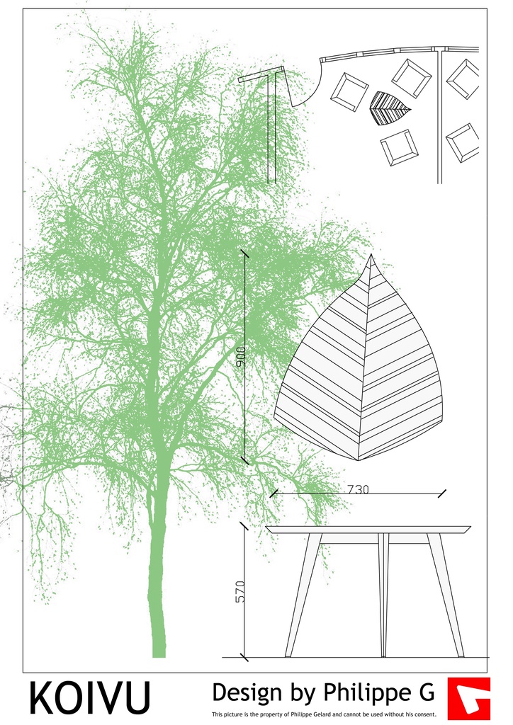 Je voulais aussi faire des tables uniques, donc toutes différentes. Pour rendre cela évident, j'ai donc décidé de leur donner la forme d'essences communes en Finlande. Je vous laisse deviner :-)