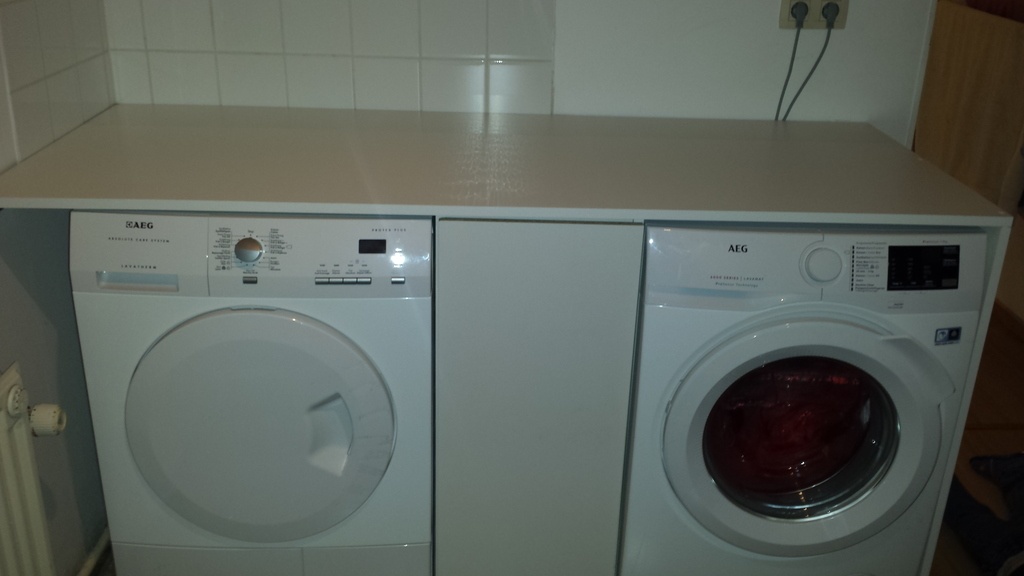 Le plan de travail fait 1750×700mm pour une hauteur de 880mM. Entre les machines j'ai fait un tiroir pour ranger les produits lessiviels, c'est un caisson qui fait 500×336 et qui sert par la même occasion de support central pour le plan de travail. Il me reste la finition de certains chants et la pose de poignée pour le tiroir. Fixations lamello et tourillons.