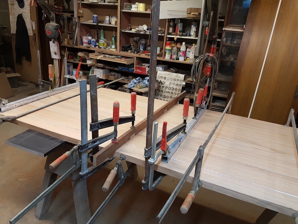 On passe ensuite au collage et serrage avec des serre-joints. J'ai depuis investit dans des dormants, autrement plus confortables ! Le collage a été effectué en chant plat, j reviendrai là dessus en fin de réalisation.