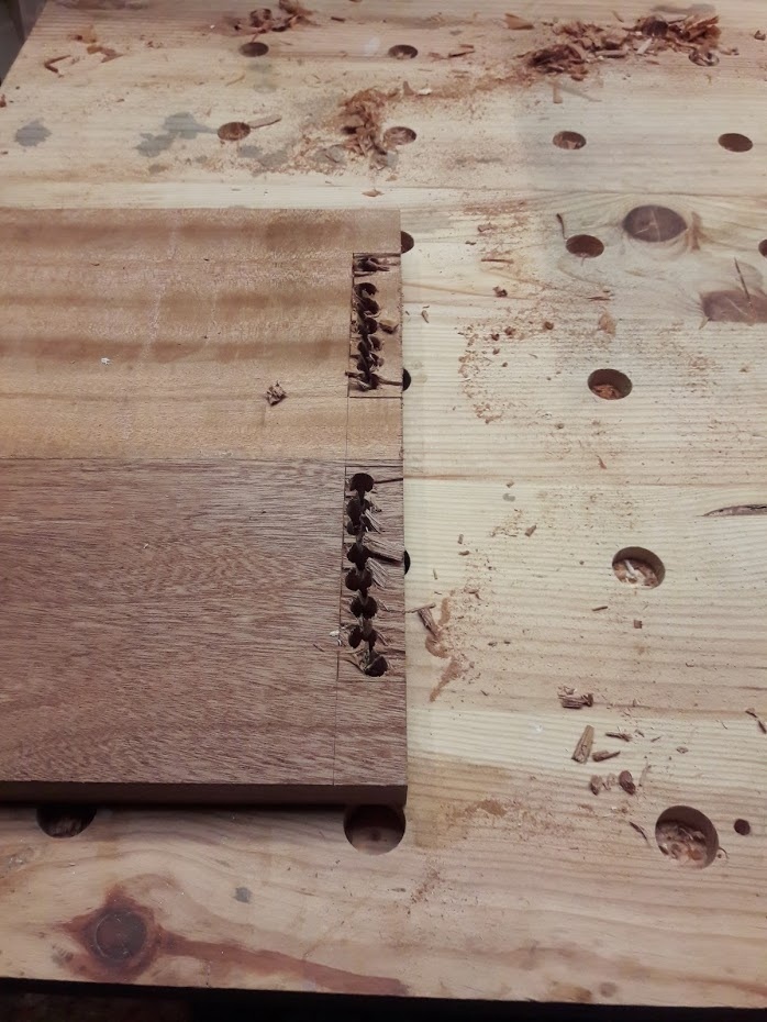 J'ai fait des queues d'aronde en deux techniques : tout au ciseau / d'abord des trous à la perceuse puis finition au ciseau.