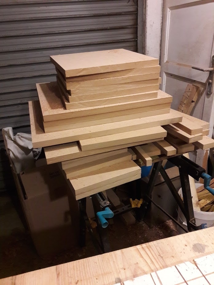 A noter la feuille en bas à gauche : toutes les planches achetées sont dessinées et j'y ai reporté les pièces du meuble : pour obtenir le plateau TV (pièce A) j'ai dû découper à la bonne longueur 3 pièces de largeur différentes.