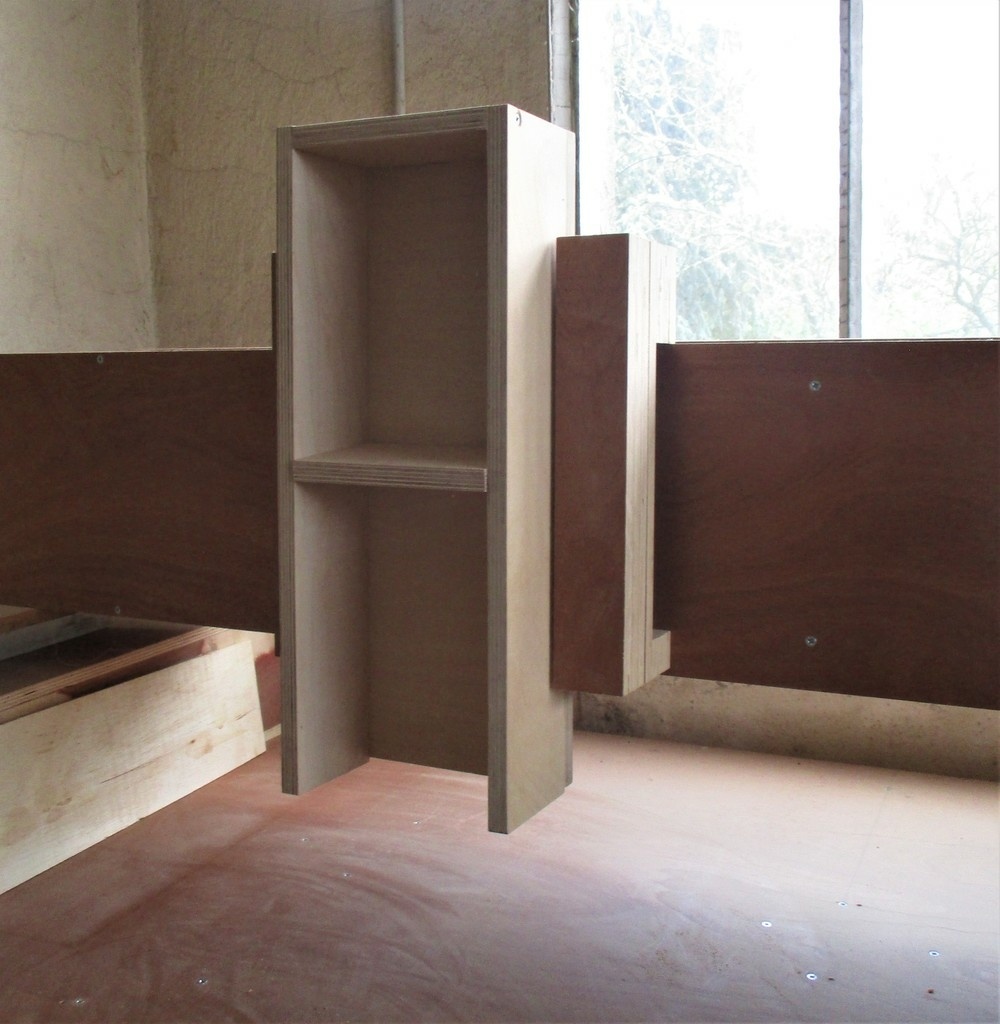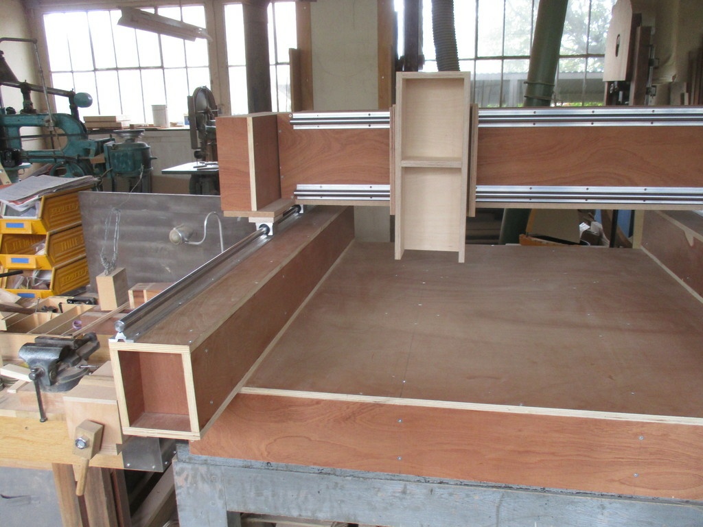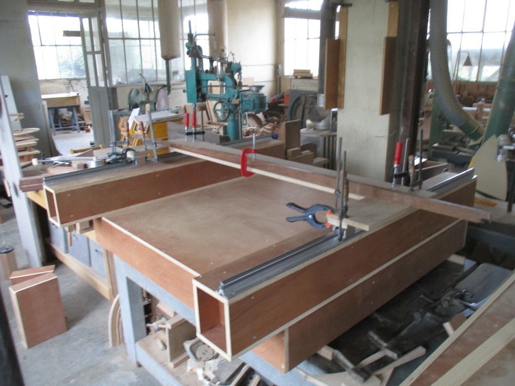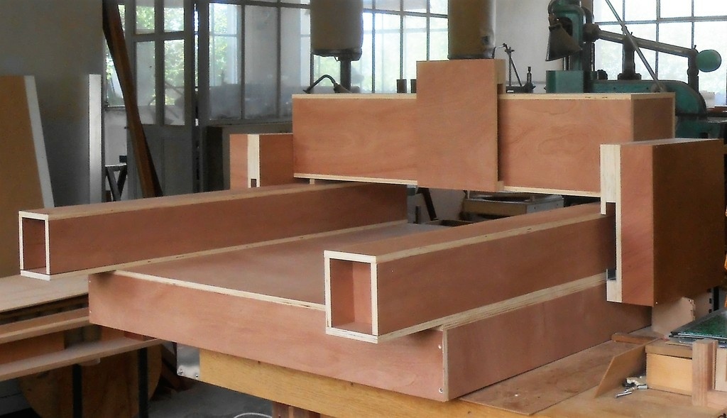 Voici la réalisation du bâti. En contreplaqué de 15 mm. Tous les caissons sont réalisés comme des boites de torsion, avec cloisonnement à l'intérieur, collé/vissé.