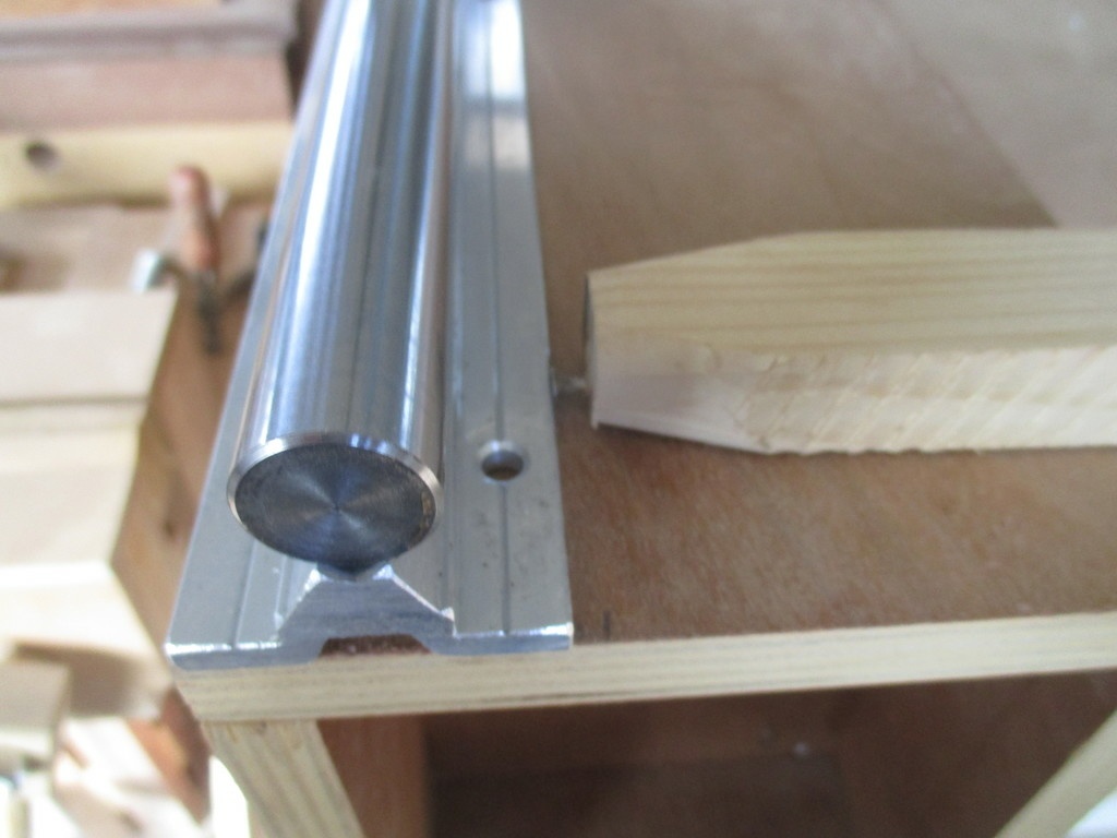 On voit à gauche le rail supporté SBR bleu foncé, et l'un des blocs coulissant sur billes, encastré dans la structure en bois pour éviter les flexions.