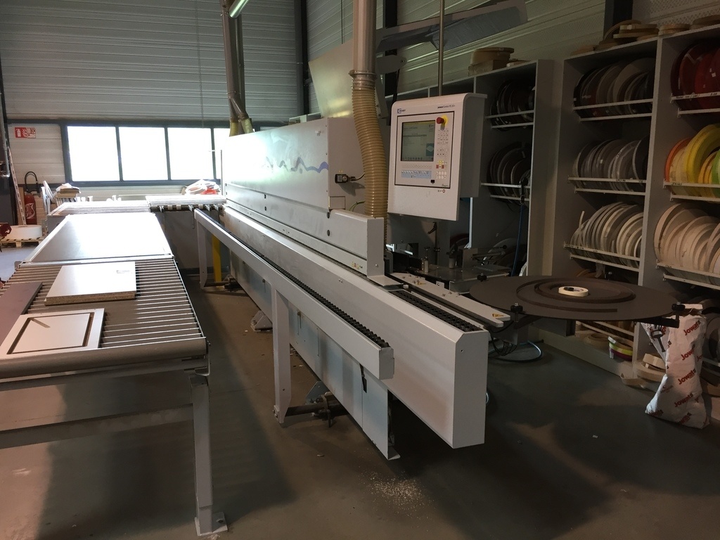Après avoir recoupé les panneaux à la bonne côte, j'ai pu plaquer les chants. Certains à la main (colle blanche et fer à repasser) d'autres à la plaqueuse de chant numérique.