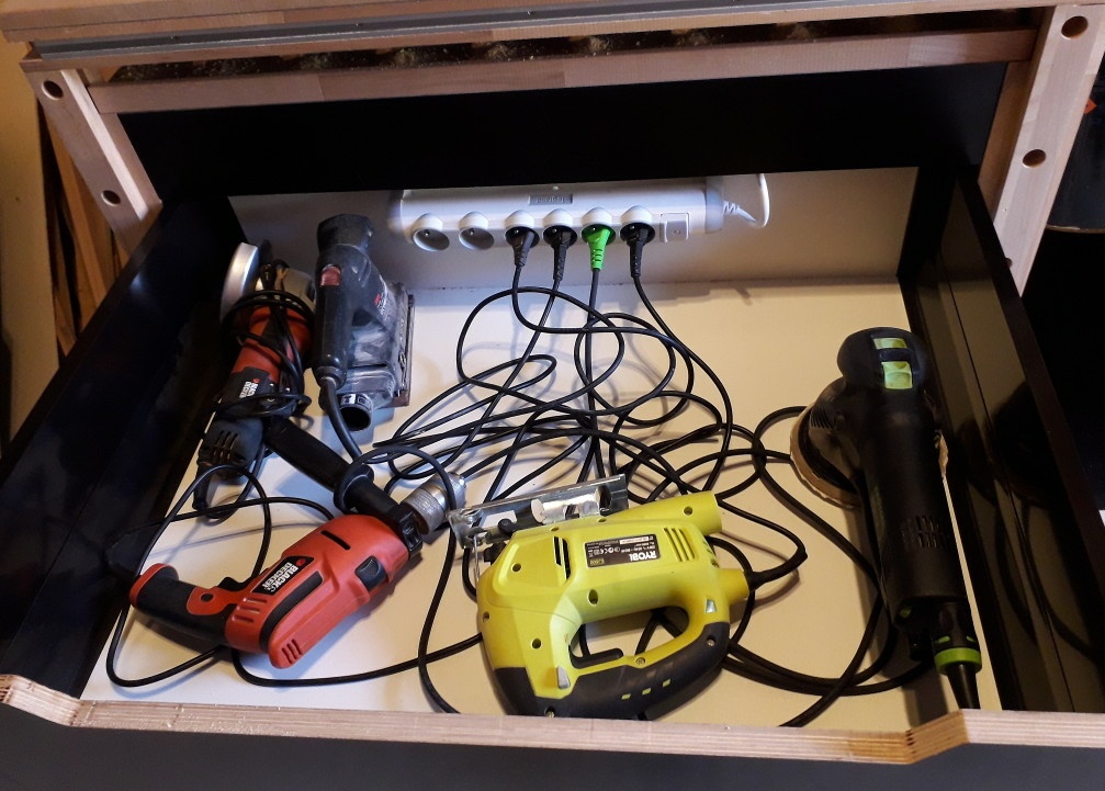 Avant de refermer le tout, j'ai fait passer le réseau électrique : une triplette alimente le tiroir qui contient l'électroportatif, 2 prises à droite pour le matériel annexe et l'aspirateur. Je n'ai pas encore trouvé d’arrêt d'urgence à un prix honnête, ça viendra. La radiale et son aspirateur dédié sont alimentés par une prise à bouton placée en hauteur, par sécurité pour les enfants.