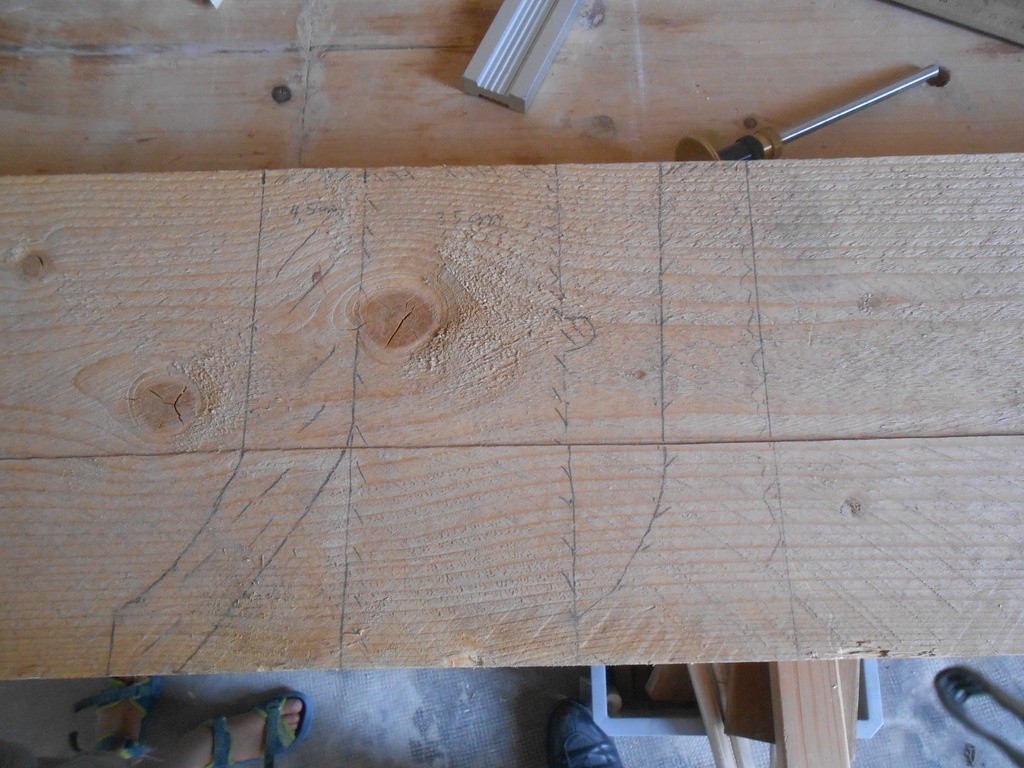 J'ai ensuite reporté les traits sur ma pièce de bois et y ai ajouté les profondeur à creuser en fonction des endroits.