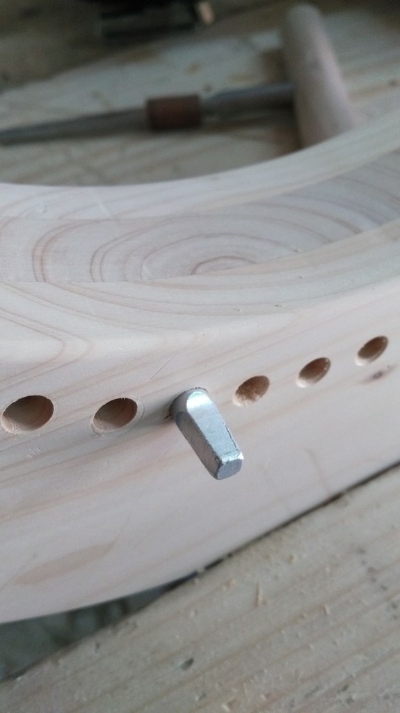 Astuce : J'ai mis un bout de tube de cuivre afin de ne pas aller trop loin, les trous seront ajustés par la suite un à un en fonction des tolérances des chevilles
