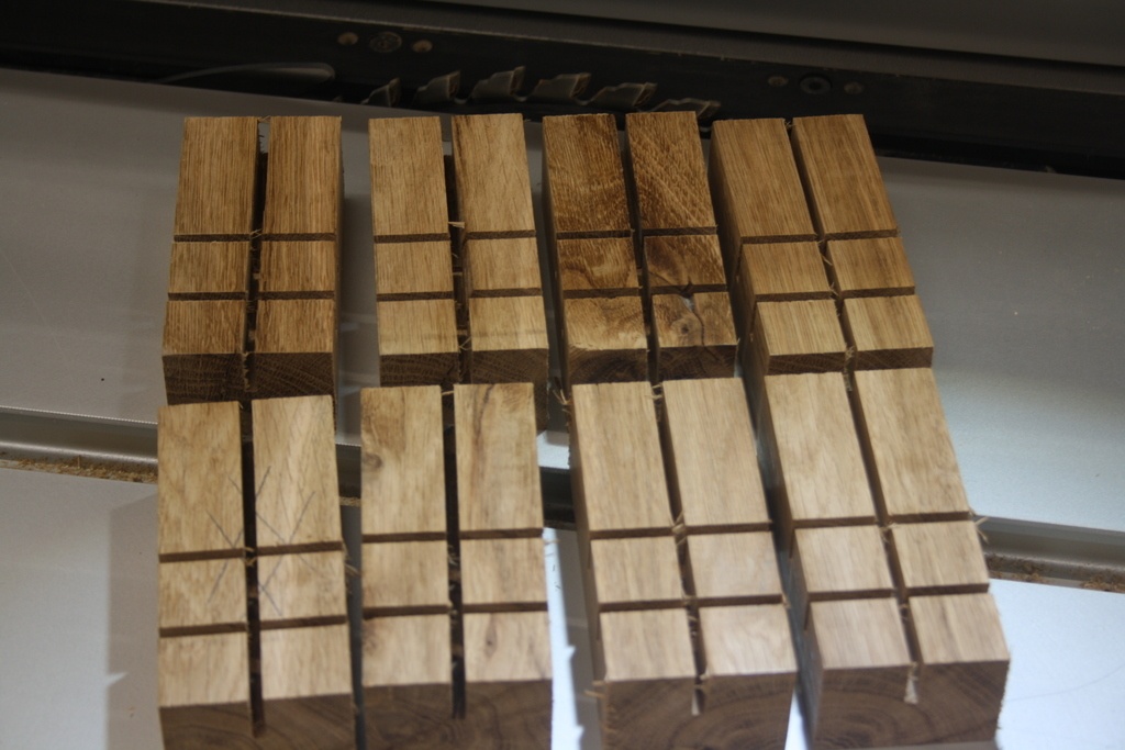 Comme la réalisation de ces « Blochets » demande plusieurs coupes différentes et que c’est une réalisation en série, j’effectue ces dernières directement sur les bois usinés.
