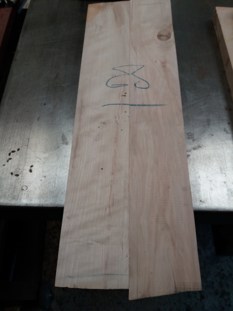 Une fois collé,le gabarit est appliqué sur ce qui sera le plateau.les contours tracés avec un crayon de menuisier. Ce dernier affûté pour l'occasion ,tenu verticalement indiquera le chemin de la scie sauteuse tout en laissant le jeu nécessaire pour le passage au bouffe-tout.