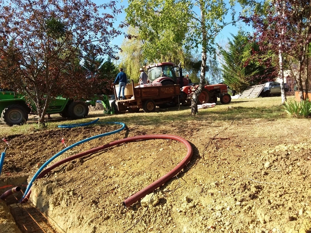 Puis poser un drain contre le mur banché et passer les gaines et combler en sable de carrière que j'ai tasser à la plaque vibrante.