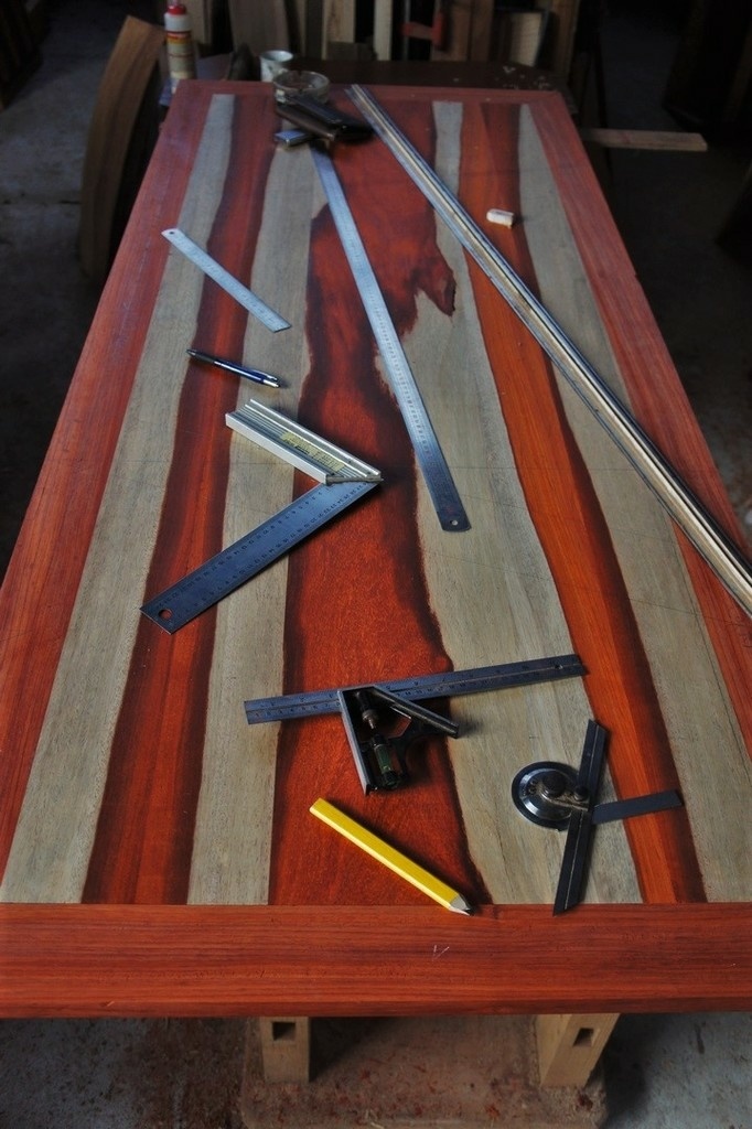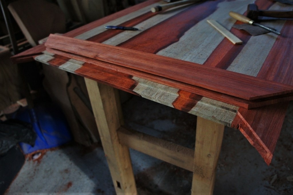 Je vous passe les étapes de corroyage, il faut juste une dégau plutôt bien réglée pour faire des beaux joints sur 180 cm de long. Bref on agence les plateaux jusqu'à ce qu'on trouve un truc qui plaît.