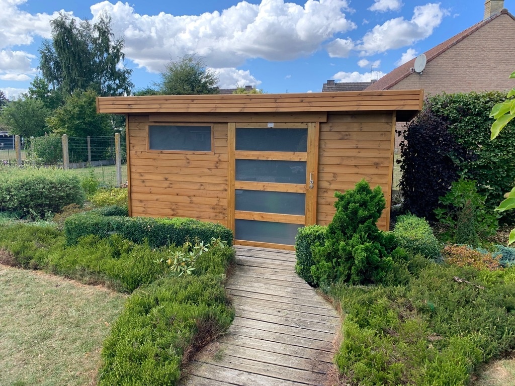 L'entreprise Veranclassic réalise les travaux de montage du projet sur 2 jours. il sera en lames de sapin rouge sur cadres vissés et la toiture en tôle acier sur lattes.