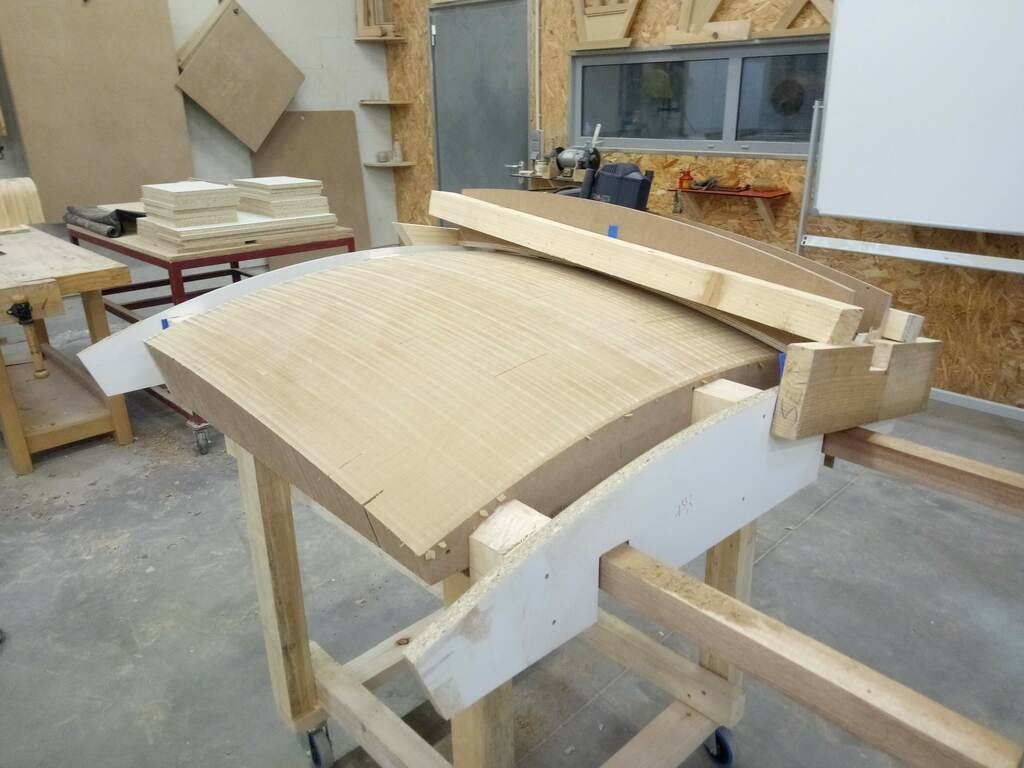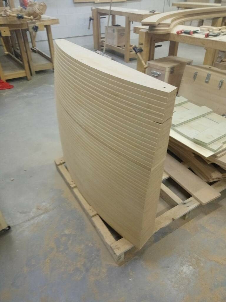 La façade cintrée bombée, quelle finition de surface prévue ?? âme en massif, avec cp+placage moulé en force ? (compliqué) , ou assemblages tout en massif (panneaux cp contrecollés en capable) en croche encore pas dessiné ?