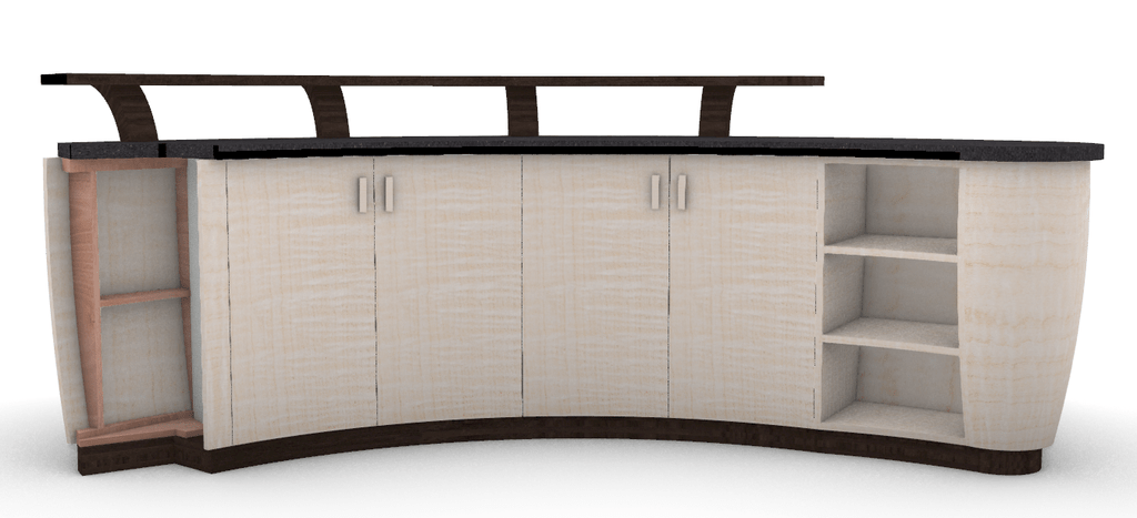 Il s'agit d'un comptoir avec la façade qui est cintrée conique bombé sur laquelle seront fixé des oies (le symbole des Compagnons du Devoir), ces dernières seront réalisé en lamellé collé. A l'intérieur on trouve 4 caisson en mélaminé avec des portes cintrés en plan et un caisson ouvert servant de jonction entre la façade cintré conique bombé et les caissons en mélaminé qui sont d'aplomb. le plan de travail inférieur sera en stratifié imitation pierre et le plan de travail supérieur sera composé d'alèses en lamellé collé et de panneau plaqué qui formeront un panneau arasé. ce dernier sera soutenu par 4 arêtiers cintré en noyer.
