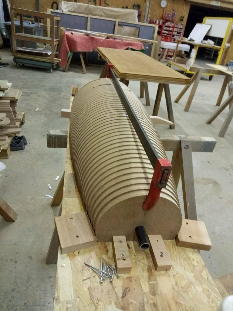 Le moule pour le panneau du bout est composé de 47 "tranches" de MDF de 19 mm dans lesquels j'ai percé un trou au centre. Toutes ces tranches sont collées et vissées entre elles. Elle on été assemblé sur un tube métallique qui servira d'axe de rotation pour le tournage final du moule.