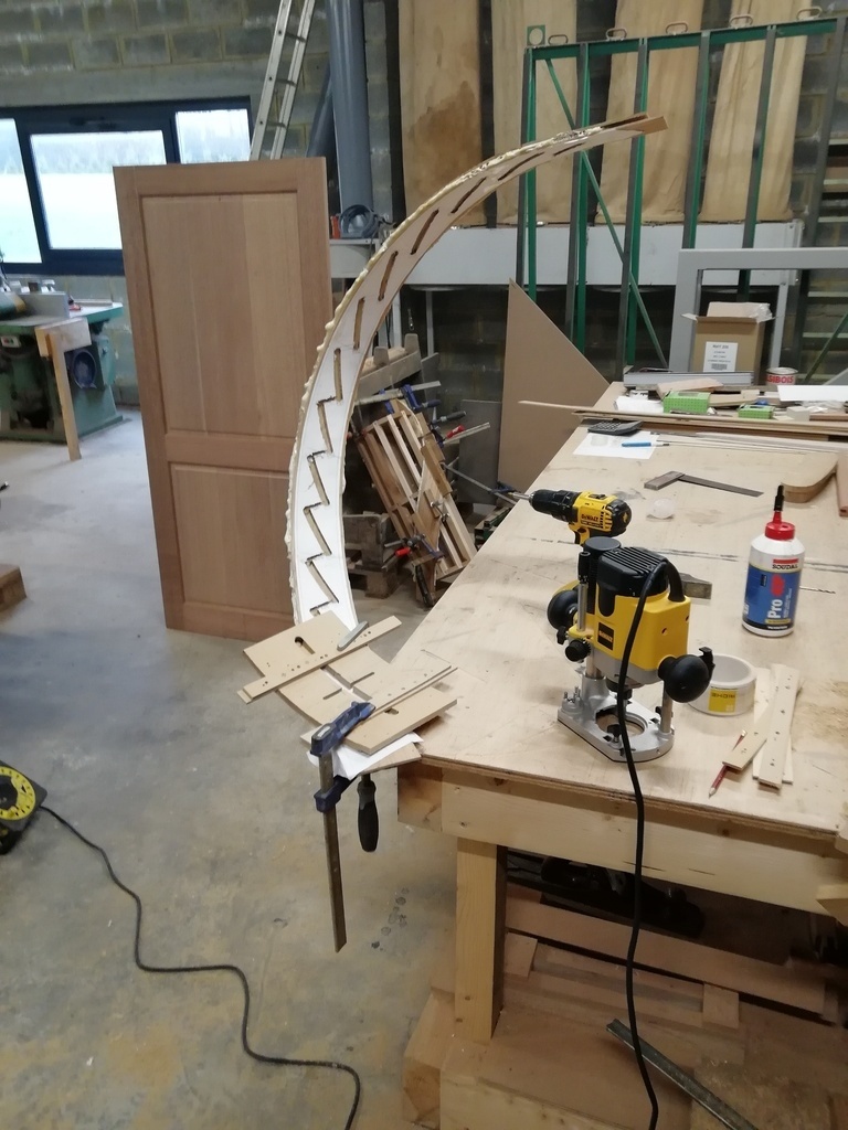 Ensuite vient la fabrication des moules. Ici j'ai utilisé du mdf pour éliminer les chutes dans l'atelier mais je conseille d'utiliser du CP qui sera bien plus résistant. Pour réaliser les formes: traçage, défonceuse sur compas et ensuite entaillage des lattes. Le moule est volontairement plus grand pour permettre de revenir droit, ce qui me facilitera le sciage des abouts par la suite.