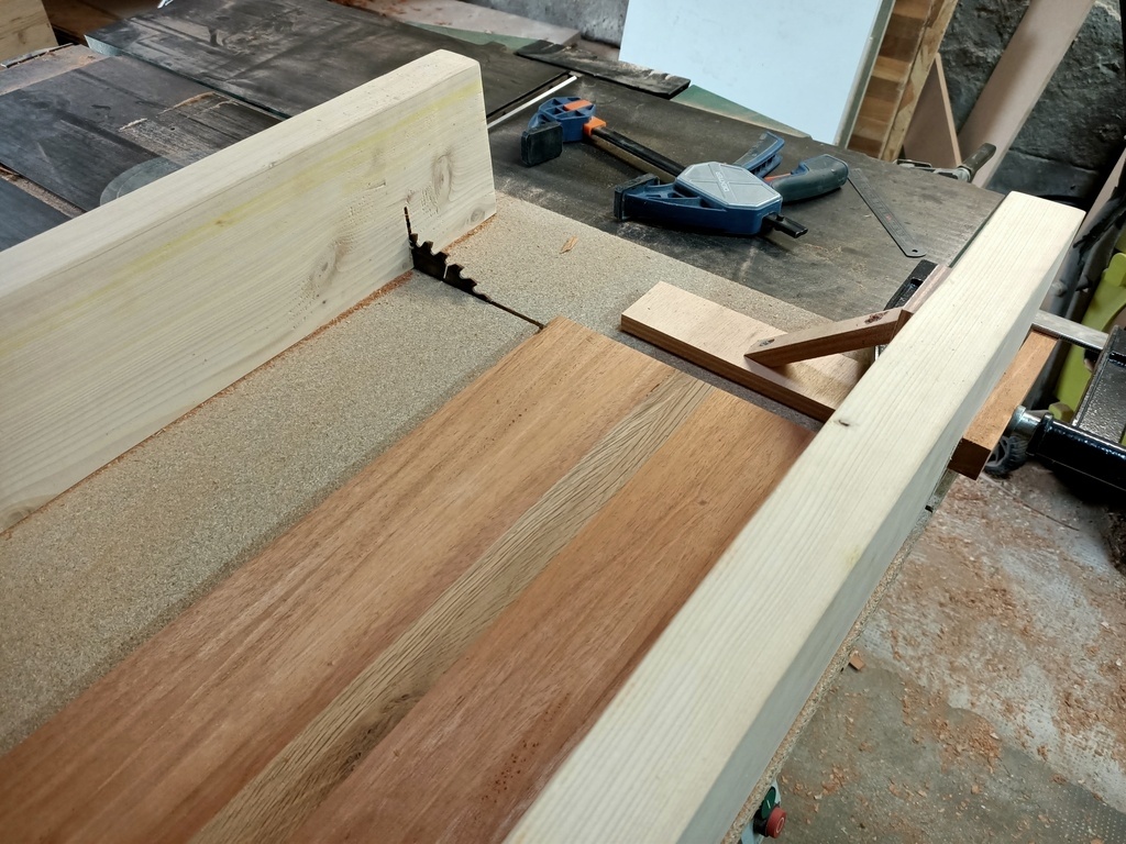 Les deux planches obtenues sont découpées avec mon traîneau de coupe et une butée. Là encore, on ne touche pas à la butee entre la découpe des deux planches pour que les carreaux de la planches soient tous égaux.
