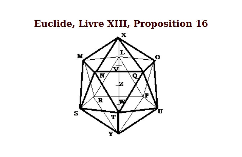 A partir du traité d'Euclide, ci-dessous, la construction de l'icosaèdre se fera dans la position avec deux sommets en haut et en bas, ou reposant sur une "pointe", en l'occurrence Y.