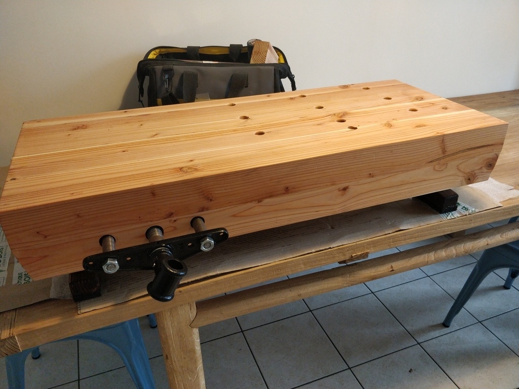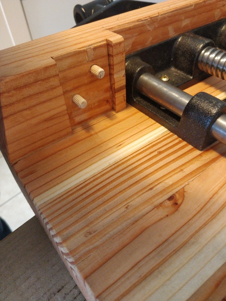 Idem, avec des chevilles pour tenir le plan pendant le serrage. Il y a un léger décalage à l'arrivée à cause de la mauvaise précision de mes perçages, mais ça va se rattraper facilement avec un coup de rabot.