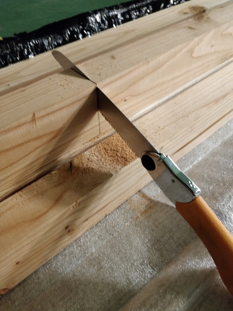 Un coup de scie en diagonale et un coup de scie pour récupérer le pied sur le joint de colle. Ce n'est pas évident, donc j'ai taillé plus large et j'ai fini au ciseau et rabot de paume.
