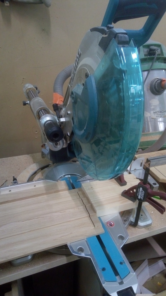 Je dois maintenant réaliser les languettes en bout des panneaux. Je passe un coup de scie pendulaire pour araser et ne pas avoir d'éclat en sortie de coupe à la toupie, car je suis en travers fil. Puis je fais une feuillure à la toupie avec l'outil par dessus pour faire la languette du panneau. J'ai fait une cale en contreprofil à la scie a ruban pour pouvoir passer mes pièces à l'entraîneur, car les panneaux travaillent vite en enlevant beaucoup de matière et seulement sur une face.