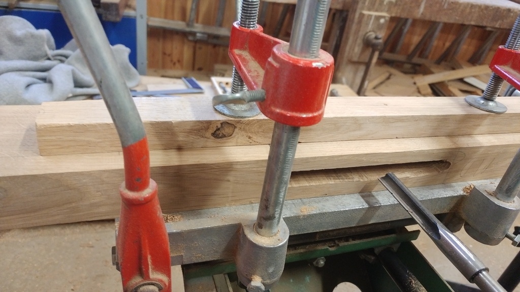 Les mortaises (largeur: 12mm; profondeur: 90mm - 70 pour tenons + 20 mm de ravancement d'onglets) sont réalisées en 2 temps afin de garantir un minimum de précisions: d'abord avec une mèche de 8, puis une mèche de 12. A chaque changement de mèches (il y en avait beaucoup car j'avais plus facile à changer les mèches que déplacer les montants), je devais donc régler les butées en conséquences. Evidemment, lors de l'usinage de la dernière mortaise, je me suis planté et ai quasiment traversé le montant (voir photo). Heureusement, ce sera situé sur le bas du montant près du dormant.