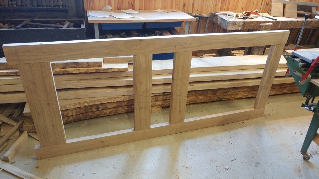 Un premier assemblage donne déjà une idée de la structure. A ce stade, j'ai déjà pu réajuster beaucoup de tenons. Quelques désaffleurs significatifs au niveau des assemblages sont également présents; je ne corrige toutefois pas trop à ce stade pour éviter des jeux trop importants.
