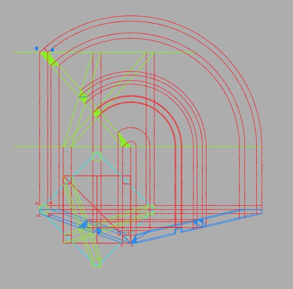 Pour obtenir la vraie grandeur du montant nous allons faire un rabattement du montant en élévation sur le plan horizontal. En prenant comme centre de charnière le point a' nous rabattons tous les point du montant en élévation sur la ligne de terre. La rencontre de ces lignes de rappels avec celle issue de la vue en plan définisse la vraie grandeur du montant ici en bleu.