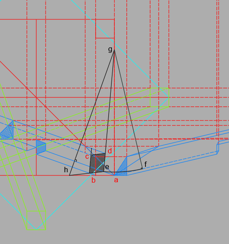 Sur la vue en plan tirer une droite perpendiculaire à l'arête principale d'un point quelconque ici f qui va couper la trace de l'implantation en plan en g. De g et perpendiculaire à l'arête du montant de la vue en plan tirer une droite qui vient couper l'autre trace en plan en h. Puis de g comme centre de rotation rabattre f depuis la vraie grandeur sur la vue en plan pour trouver le point e. il reste à relier gef pour trouver l'angle de corroyage des pieds, tirer parallèlement aux faces avant les faces arrières. Une fois l'angle de corroyage nous avons tous les éléments pour pouvoir tailler la pièce .