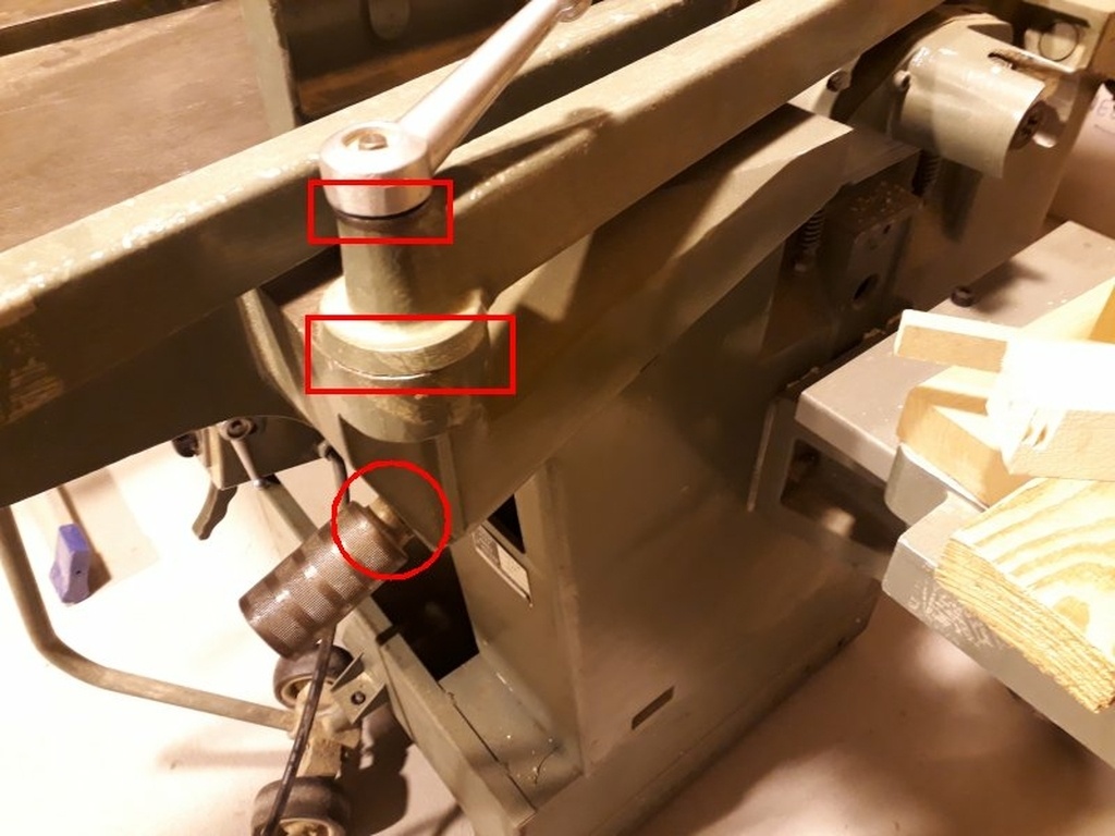 La machine possède 3 cylindres à crémaillère, pour la raboteuse, la toupie et la mortaiseuse. Dans les 3 cas il faudrait, pour bien faire, nettoyer à l'essence pour enlever la vieille graisse et la crasse, essuyer et re-graisser.