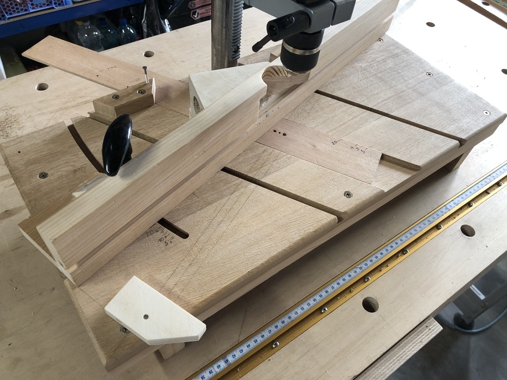 Dans mon cas, le guide est en fait une équerre avec des trous de 20 mm faite pour mon établi, et l'axe de rotation est l'un des dogholes de mon établi.
