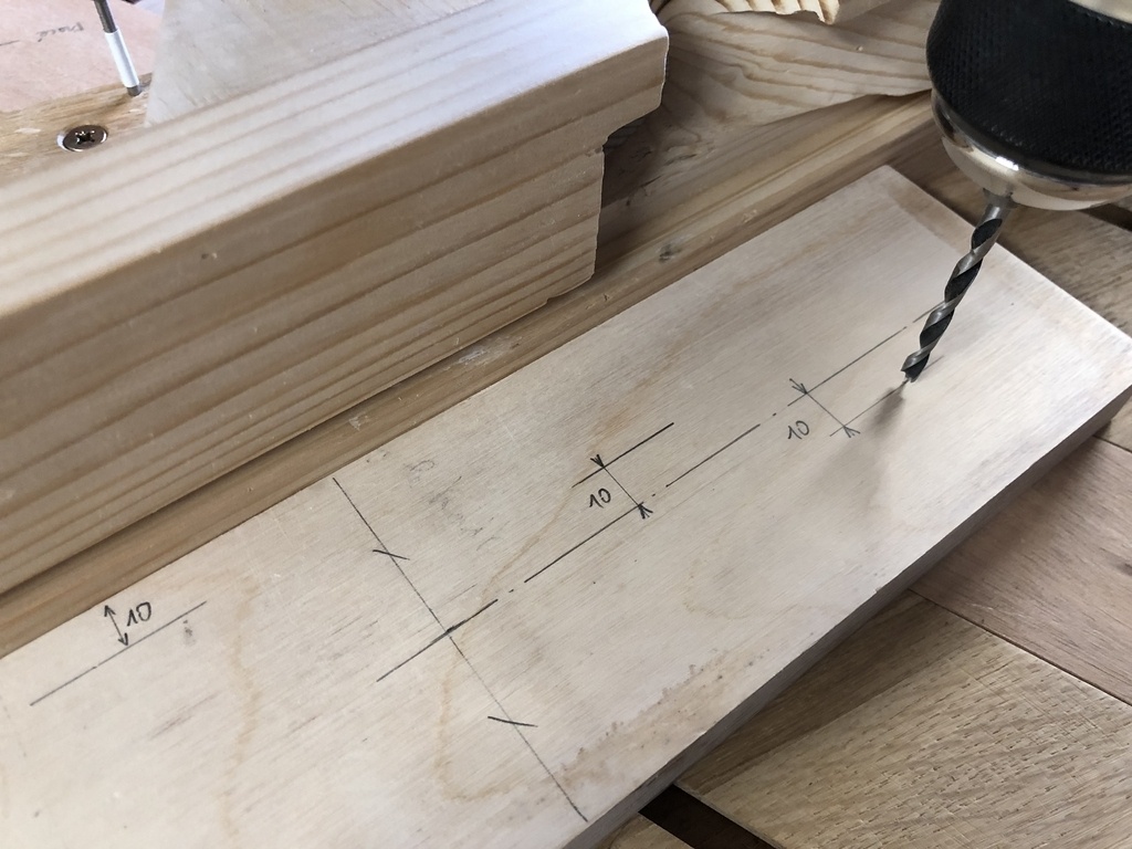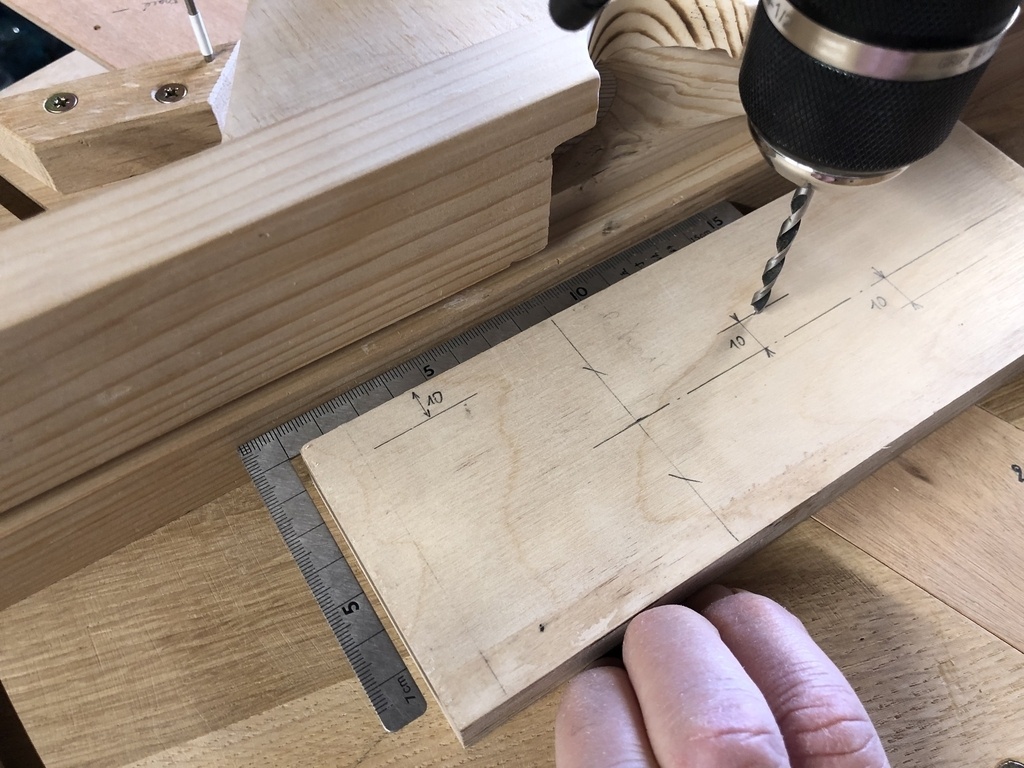 Quand comme moi on a fait un trou ce 20, on peut mettre une Forstner à l'envers dans le trou et utiliser la pointe comme repère, ou bien utiliser un réglet de 10 mm de large comme sur l'illustration ci-dessous.