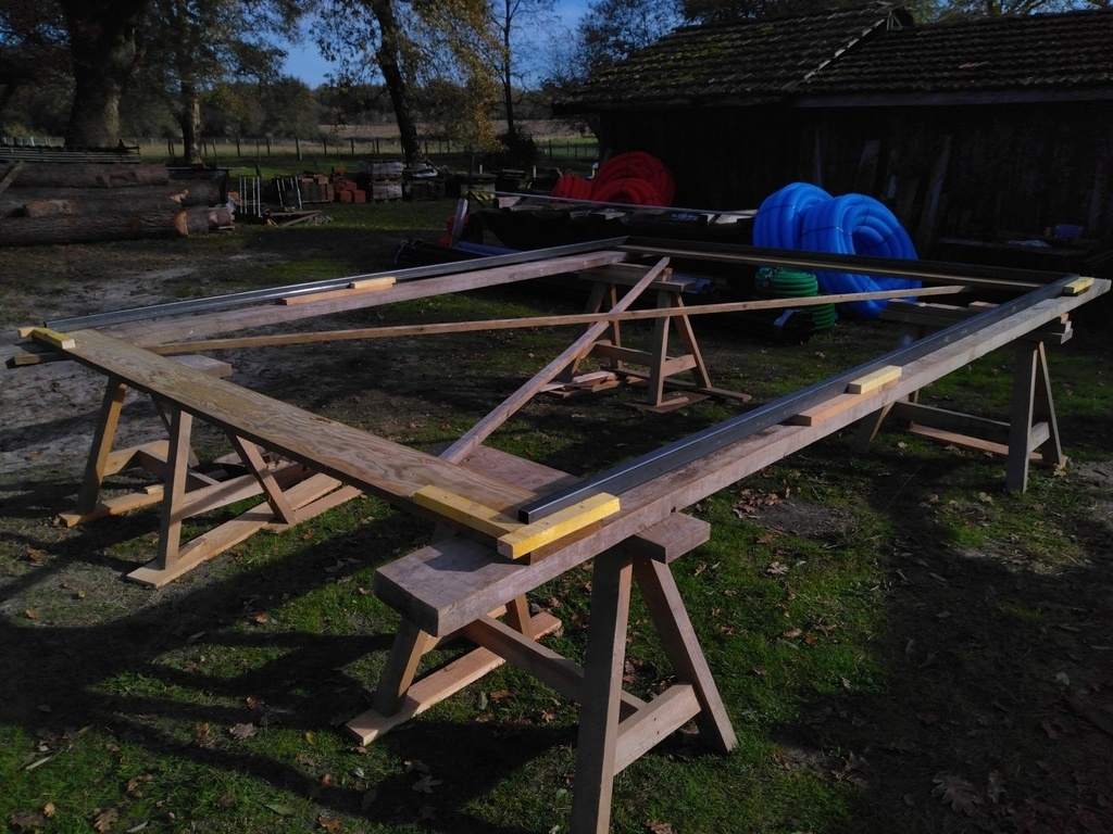 Les fermes sont taillées, je peux déplacer les plateaux pour la mise sur lignes des pannes. J'en ai gardé certains en places ( 7m80 d'entraxe ferme, 4m075 entraxe pannes ), deux en pied pour le trait carré, calage à la demande pour les autres.