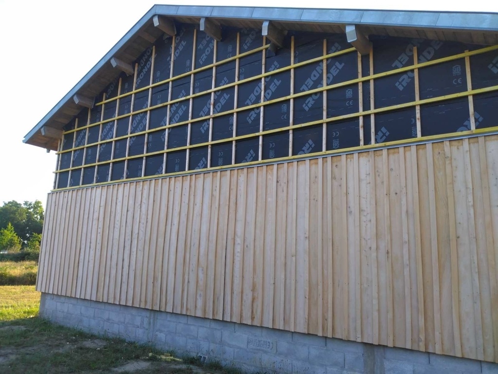 Perçage directement entre poteaux/pannes, pointage liens pour la tire, délardement, idem pour les sablières du côté opposé.