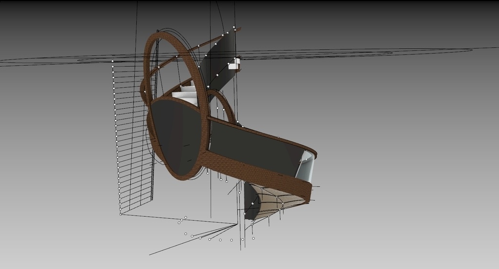 Voici une étude en cours sur un escalier. Pas d'objectifs réellement définis, c'est un exercice pour continuer de faire fonctionner les méninges sur le trait et, pourquoi pas, pouvoir communiquer aux prescripteurs en architecture pour faire naître d'éventuels projets. Il faut que je trouve un peu de temps pour finir le dessin, il reste notamment la partie la plus intéressante, les quatre pièces gauches de jonctions du plafond rampant issues de la pénétration de la trompe reliant les deux soubassements des médaillons et des deux volées de plafond rampant. les visuels ne sont pour le moment pas très agréables à regarder, c'est de l'épure, j'ai bon espoir de rendre ça plus présentable une fois fini.