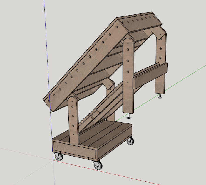 je ne l'ai pas encore conçu car je n'ai pas encore trouvé les palettes et je manque un peu d'outillage à l'instant où je poste ce plan ... comme une défonceuse par exemple qui me servirait bien pour faire tous ces trous ou une perceuse à colonne.