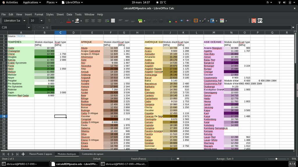 - module élastique de l'essence considérée (voir feuille 2 du tableur, extraits de TROPIX);