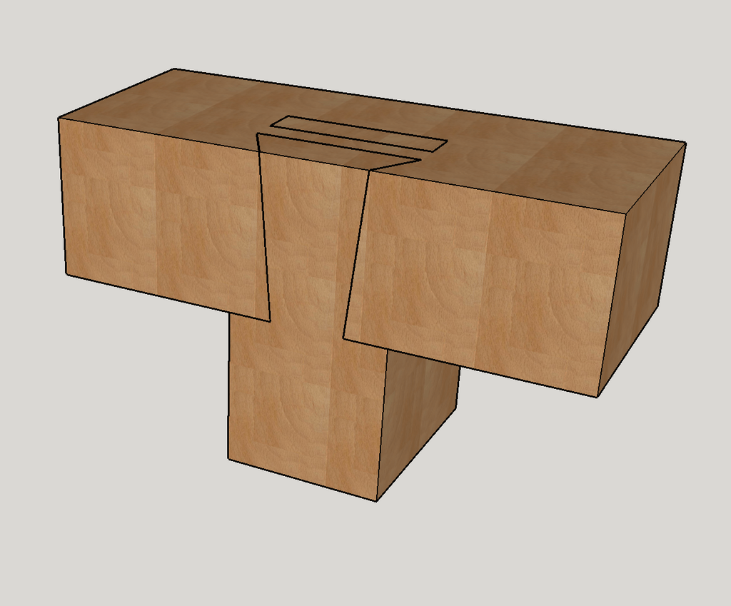 Il existe un montage similaire mais monté en "tordant" le tenon, ce qui évite d'avoir une coupe oblique qui fragilise (un peu) le montage, et permet même d'avoir deux assemblages symétriques à queues d'aronde ! Un peu inutile pour un piétement mais c'est intéressant. Voir la vidéo de Samuel Mamias sur la realisation du maillet impossible de Roy Underhill : youtube.com/wa...h?v=2wxRbskyYDs.