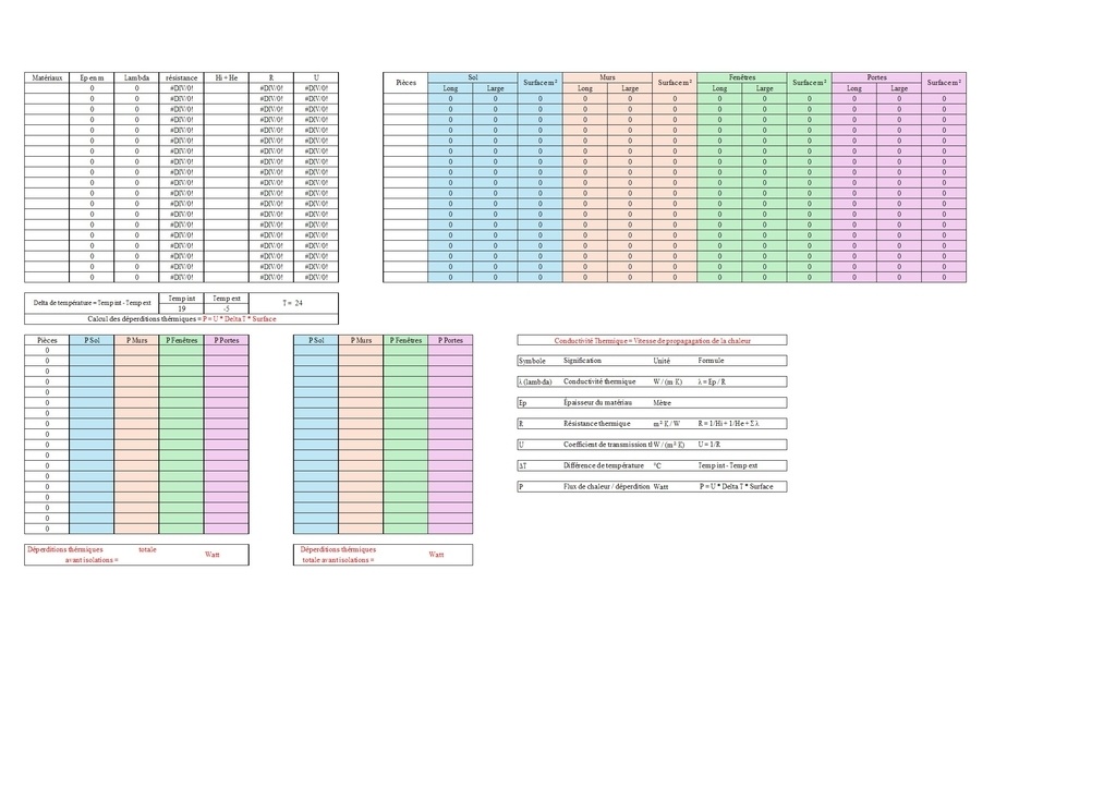 Ce tableau Excel a été conçu pour calculer les déperditions thermiques d’un local ou d’un bâtiment, à partir des caractéristiques des parois et des matériaux utilisés.