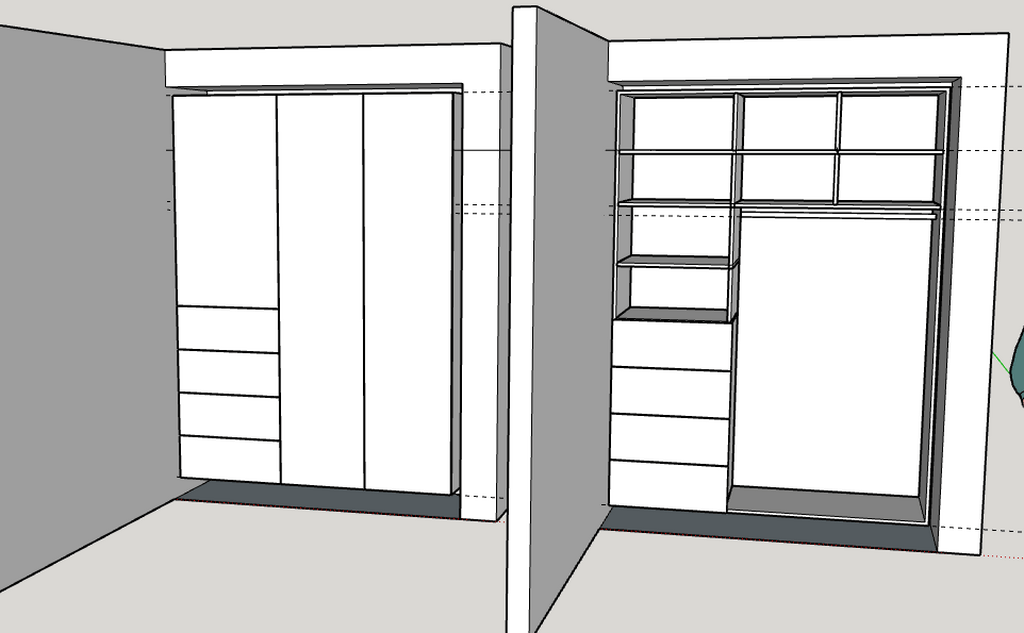 Les couleurs des bois sont fausses (mais ça me permettait d'identifier facilement dans Sketch UP. En pratique ça sera tout en blanc avec les portes en blanc PrefectSense PM de Egger.