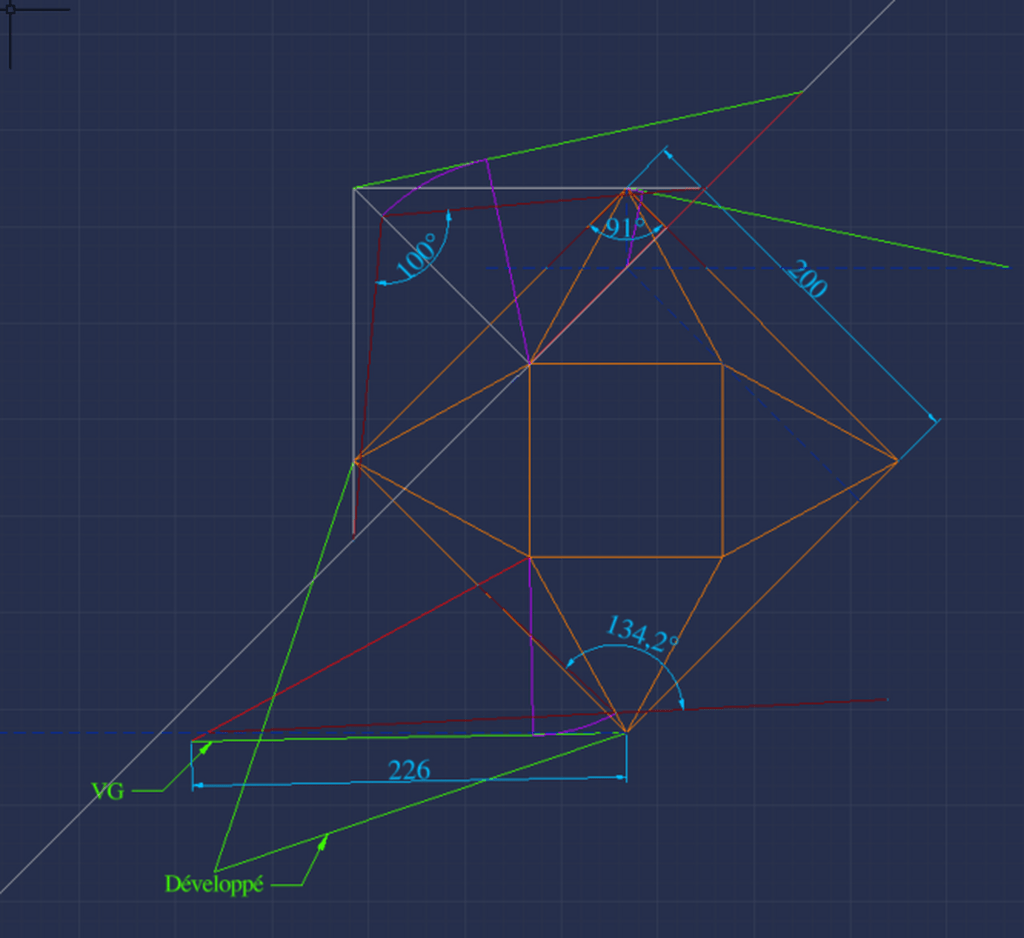 Toutes les infos pour les découpes y sont. Pour les contrecoupes, il faut utiliser le développé avec la partie en pointillé, qui correspond à l'angle de guide à mettre avant d'incliner la lame de scie. Ces pointillés représentent les pyramides à 4 pans, avant intersection d'une pyramide dans l'autre.