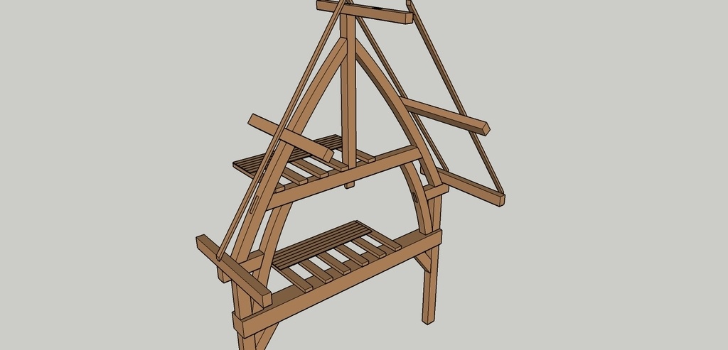 Voici un plan susceptible de retenir l’attention des charpentiers du patrimoine. J’ai repris scrupuleusement un dessin 2D et les explications publiés dans la revue d’une société savante au début du XXème siècle : Les combles des maisons du XVIe siècle, à Rouen, par le Capitaine Raymond Quenedey, in Bulletin Monumental - Année 1911 - 75 - pp. 247-264, publié en ligne par persee.fr.