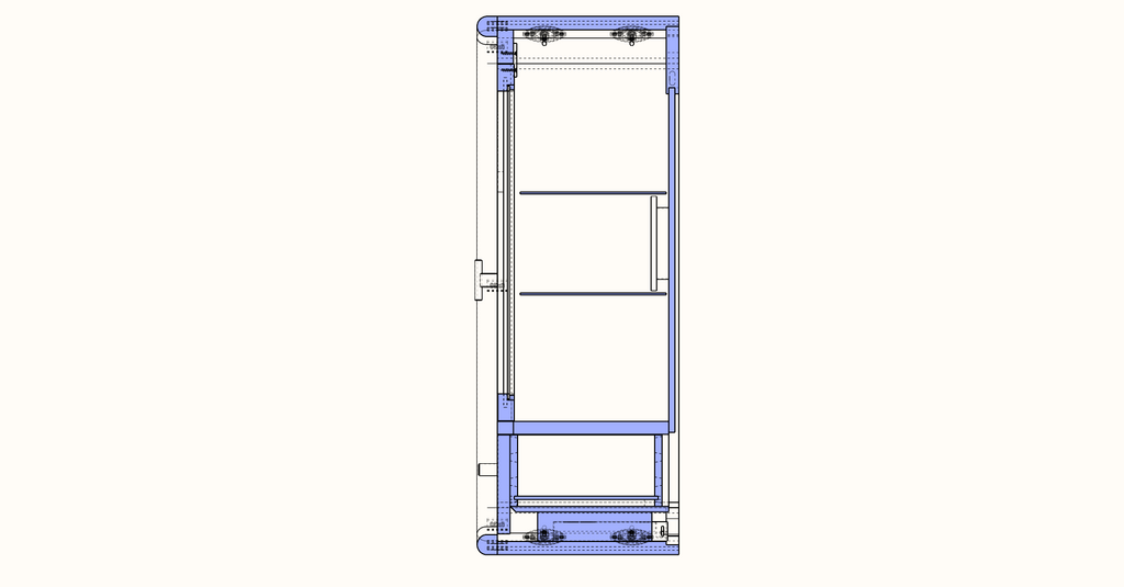 Elle est en sycomore massif pour les arrondis du caisson ainsi que les alèses en façades, en latté frêne replaqué sycomore 9/10°mm pour les faces. Les portes vitrées avec parcloses et les façades de tiroir sont en noyer massif et reçoivent une teinte hydro alcoolique au choix des élèves.