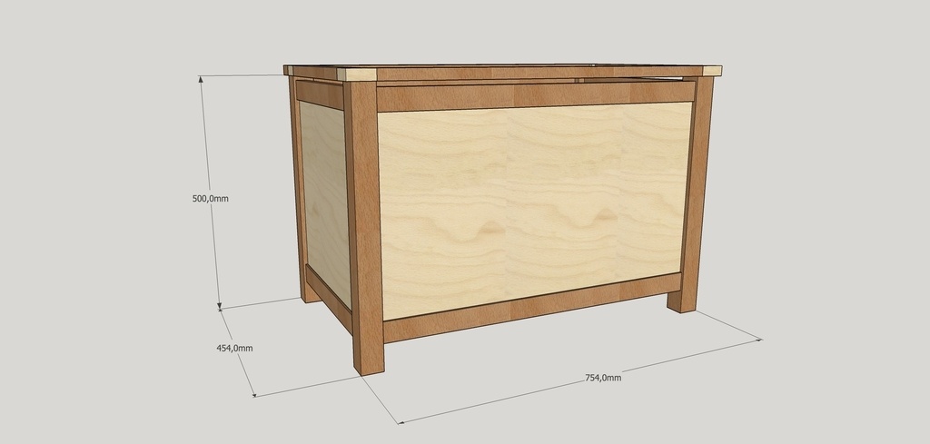 Coffre à jouet en Hêtre et Frêne.50 cm de haut pour 75,4cm de long et 45,4cm de large.Assemblages: Tenons-mortaises / Feuillures / Rainures-languettesLe fond du coffre est en contre-plaqué.