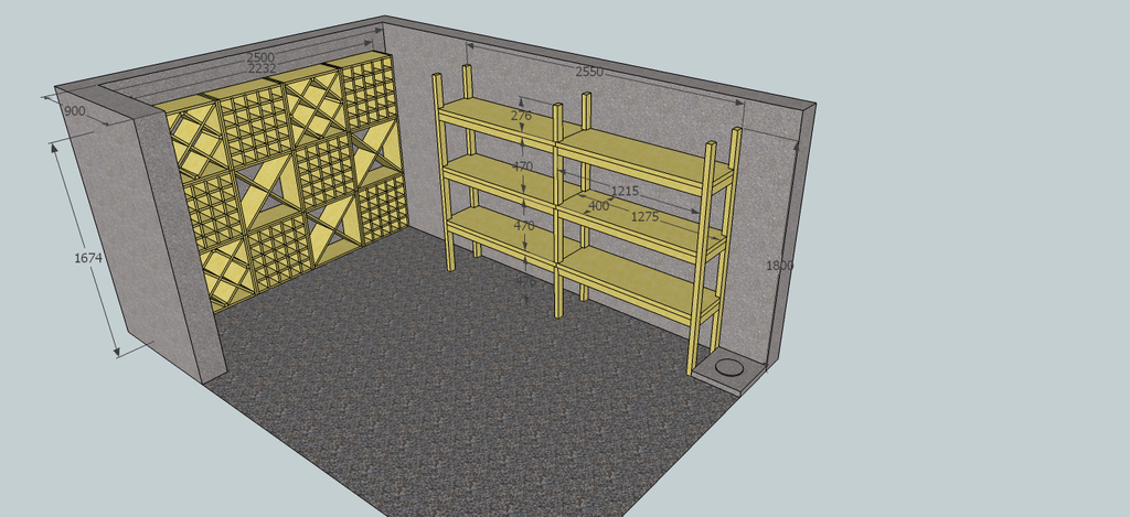 Plan d'un aménagement de cave à vin. 12 casiers pour des bouteilles de vin + étagères.