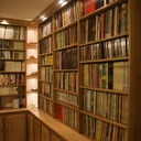 Ce plan est une conception originale aux dimension de la pièce. Je voulais une bibliothèque qui aille jusqu"au plafond. La corniche est vissée dans les rails qui tiennent le placo. Les planches verticales sont retenues par le même système que celui utilisé pour caler les plateaux et visible sur la photo : des crochets de 4mm insérés dans une encoche faite à la fraise pour les lamelles. Les étagères horizontales sont vissées aux taquets pour éviter l'écartement.