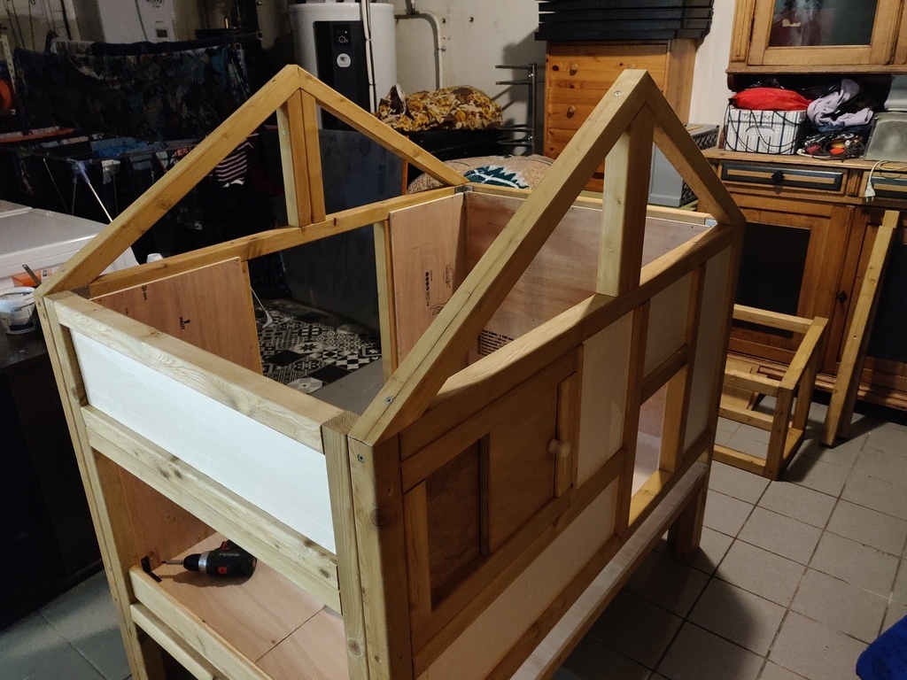 Pour les murs du poulailler, l'intérieur est recouvert de contreplaqué de récup, le milieu est une plaque d'isolant de 3cm et la partie extérieur est du bardage qui s'imbrique classe 3. J'ai donc rempli en horizontal l'armature au lieu de la recouvrir entièrement en vertical.